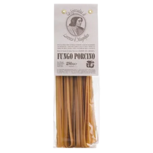 Hartweizengrießnudel mit Weizenkeimen und 4,6% Steinpilzpulver, kräftiger Geschmack. Mit 7 mm eine etwas breitere Variante des klassischen Formats. 14 Minuten in siedendem Wasser garziehen lassen. Der Teig wird fein ausgerollt und 36 Stunden lang bei niedriger Temperatur getrocknet. Ideal als Beilage zu Wild, Hase oder mit frischen Steinpilzen.