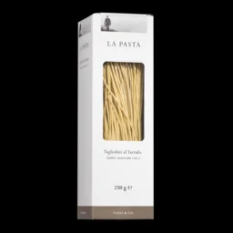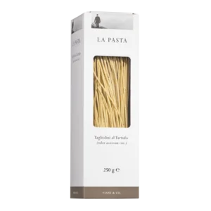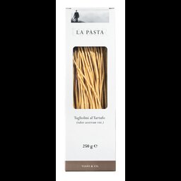 Handwerklich hergestellte, besonders aromatische, dünne Bandnudeln aus Hartweizengrieß und 30% Ei. Der Anteil an Sommertrüffeln ist 3%. Die Garzeit beträgt nur rund 5 Minuten. Um den Trüffelgeschmack bestmöglich zu erhalten, sollte man die Pasta in kochendes, leicht gesalzenes Wasser geben, dann aber abgedeckt ziehen lassen.