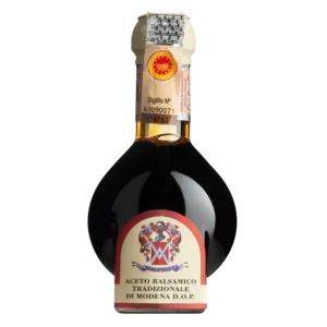 Der jüngste Essig dieser Selektion muss mindestens 12 Jahre alt sein und bedarf wie alle anderen auch der Qualitätskontrolle des Consorzio. Komplexe Aromen und eine harmonische Fülle adeln diesen echten Tradizionale di Modena. Er schmeckt zu gegrilltem Fleisch. würzt Dressings von Wintersalaten und Saucen zu dunklem Fleisch wie Rind und Wild.