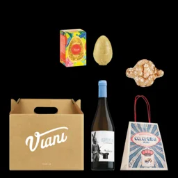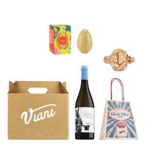 Die kleine Geschenkbox mit Osterüberraschungen lässt sich sogar verstecken. Im Innern wartet ein Wein mit Hasenetikett zum Anstoßen auf Ostern, ein Vermentino di Sardegna DOC. Dazu schmeckt eine klassische Colombina und zum Dessert das köstliche Osterei mit gehackten Pistazien des Traditionschocolatiers Venchi.