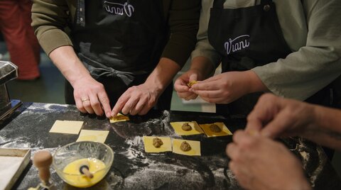 Der Abend beginnt mit einem entspannten Aperitivo zum gegenseitigen Kennenlernen. Nach einer kurzen Vorstellung des Menüs und der Erläuterung der Zutaten durch unser Viani Team bereiten wir gemeinsam unter der Anleitung einer erfahrenen Köchin oder eines Kochs jeden Gang zu. Das fertige Menü essen wir anschließend an einer liebevoll eingedeckten Tafel, umsorgt von unserem aufmerksamen Service.