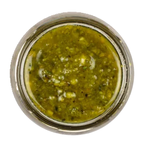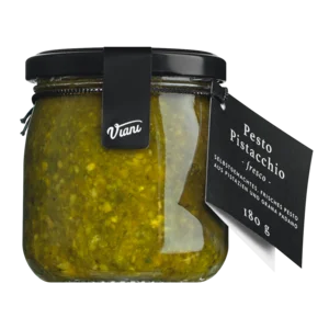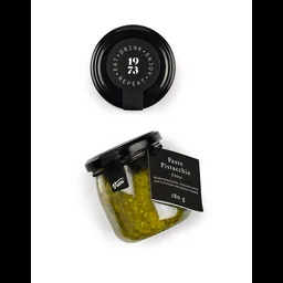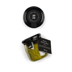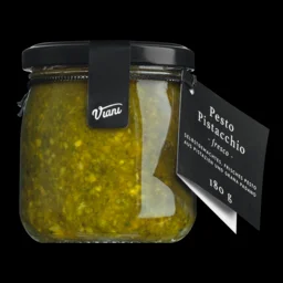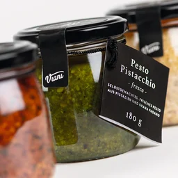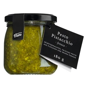 Das pikante Pistazienpesto mit Olivenöl, Knoblauch, Pecorino und Grana Padano schmeckt hervorragend zur Pasta. Der Pistazienanteil beträgt 37 %, sodass ihr feiner, nussiger Geschmack im Vordergrund steht und vom Käse angenehm unterstützt wird. Der verleiht dem Pesto seine geschmeidige Fülle. Neben Pasta kann man gegrillte Meeresfrüchte und Hühnchen mit dem Pesto würzen.