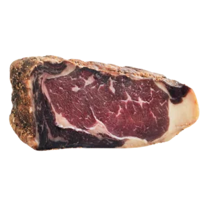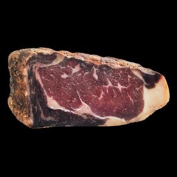 Dieses Secreto ist ein Ribeye vom Rind. Es stammt von der spanischen Rasse Rubia Gallega, deren Fleisch besonders gut marmoriert ist und einen leicht buttrigen Ton im Geschmack hat. Das Secreto wird mit sieben verschiedenen Gewürzen und Kräutern eingerieben. Dann trocknet das Stück kontrolliert sieben Wochen. Danach ruht es noch einmal zwei Wochen. In hauchdünne Scheiben geschnitten ist es ein ganz besonderes Carpaccio.
