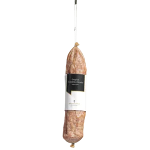 Diese typisch regionale Spezialität im Rohwurstbereich unterliegt der schlachtwarmen Verarbeitung. Es werden keine Hilfsmittel wie Starterkulturen zur Reifung verwendet, sondern nur reine Naturgewürze sowie jodiertes Salz. Diese Herstellungsmethode für Dauerwurst ist einmalig in der Welt. Die lange natürliche Reifezeit von circa sechs Monaten und die Verwendung von ausgewählten Rohprodukten geben dieser Wurst den besonderen, typischen Geschmack. Luftgetrocknet.