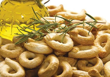 Einen apulischeren Ort gibt es nicht in dieser Region bei Bari. Alberobello besitzt die meisten Trulli und ist UNESCO-Weltkulturerbe. Terre dei Trulli, ein Unternehmen der Familie Casulli, widmet sich dort seit 2007 der Produktion typisch apulischer Spezialitäten, an erster Stelle den Taralli. Die bescheidenen, dabei köstlichen Taralli sind hier nicht wegzudenken. Es sind kleine Teigkringel aus Mehl, Wasser, Weißwein und extra nativem Olivenöl. Sie werden geformt, in kochendem Wasser gegart, bis sie aufsteigen und danach gebacken. Ihre Knusprigkeit ist unvergleichbar, sie splittern aromatisch im Mund. Terre dei Trulli benutzt ausschließlich italienische Zutaten, keine tierischen Fette und Konservierungsmittel.