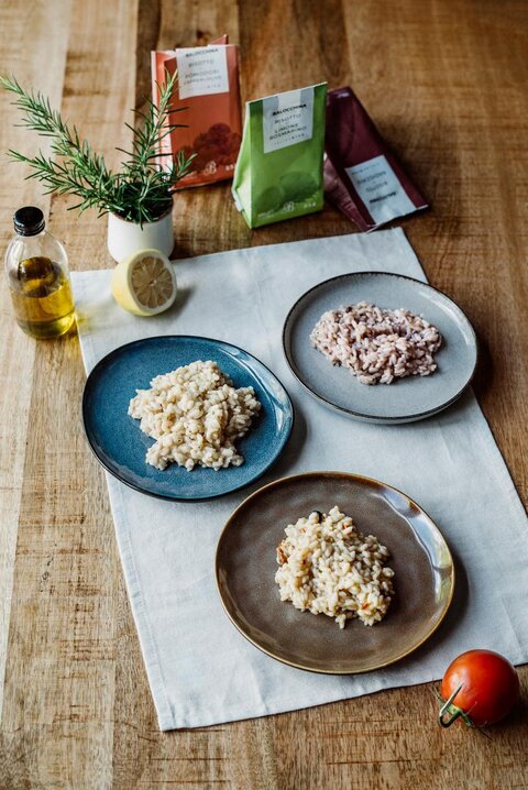 Umweltfreundlich sind auch die Verpackungen des Reises. Er ist entweder in hohe, wiederverwendbare Gläser gefüllt oder, wie die Risottomischungen, in recyclebare Papiertüten unter einer Schutzatmosphäre. Der Verschluss der Gläser ist aus Pappe und dient gleichzeitig als Messbecher für ein oder zwei Portionen.